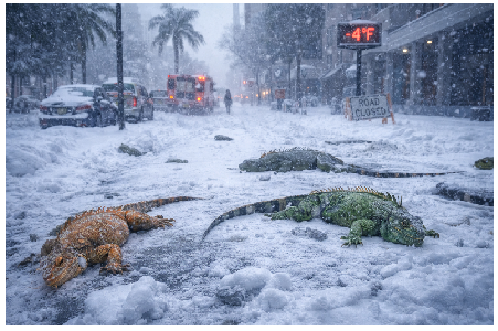 फ्लोरिडा के ऑरलैंडो में न्यूनतम तापमान माइनस 4 डिग्री सेल्सियस दर्ज किया गया, जो फरवरी महीने में साल 1923 के बाद का सबसे कम तापमान है। 100 साल बाद आई इस रिकॉर्ड ठंड ने मौसम वैज्ञानिकों को भी हैरान कर दिया है। सामान्यतः यहाँ इन दिनों तापमान 12 से 23 डिग्री के बीच रहता है। ठंड के कारण ठंडे खून वाले जीव इगुआना के शरीर ने काम करना बंद कर दिया और वे सड़कों व फुटपाथों पर बेसुध पड़े नजर आए।