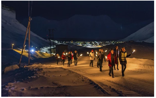 यहां के रूटीन सबसे रोचक है अंधेरे में सुरक्षा। जब आप अंधेरे में घर से निकलते हैं, तो आपको न केवल कड़ाके की ठंड मतलब माइनस 30 डिग्री तक की सर्दी से बचना है, बल्कि पोलर बीयर से भी सावधान रहना है। यहां इंसानों से ज्यादा भालू हैं और अंधेरे में वे और भी खतरनाक हो जाते हैं। इसलिए यहां के लोग हमेशा अपनी हेडलाइट्स और रिफ्लेक्टिव जैकेट पहनकर चलते हैं। यहां की सड़कों पर अजनबियों का एक-दूसरे को हेलो कहना आम है, क्योंकि इस घने अंधेरे में हर इंसान एक-दूसरे का सहारा होता है।
